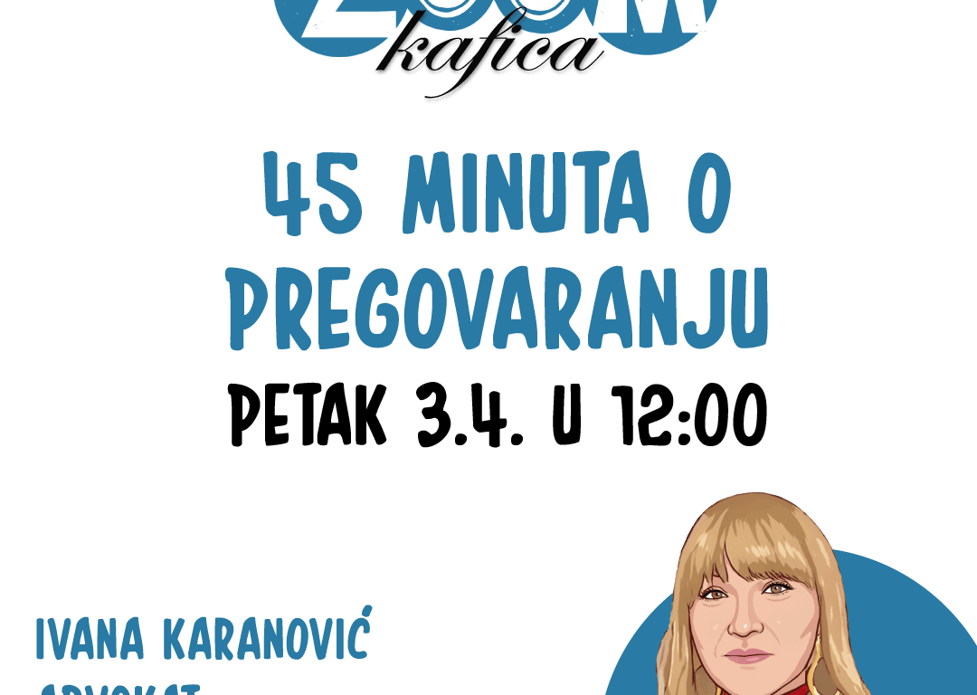 Позивамо вас на нову Зоом кафицу – 45 минута о преговарању, у петак 3. априла 2026. у 12.00 часова. Наша гошћа биће Ивана Карановић, адвокат са преко 25 година искуства у области привредног права. Учесници ће добити практичне увиде и примере …...